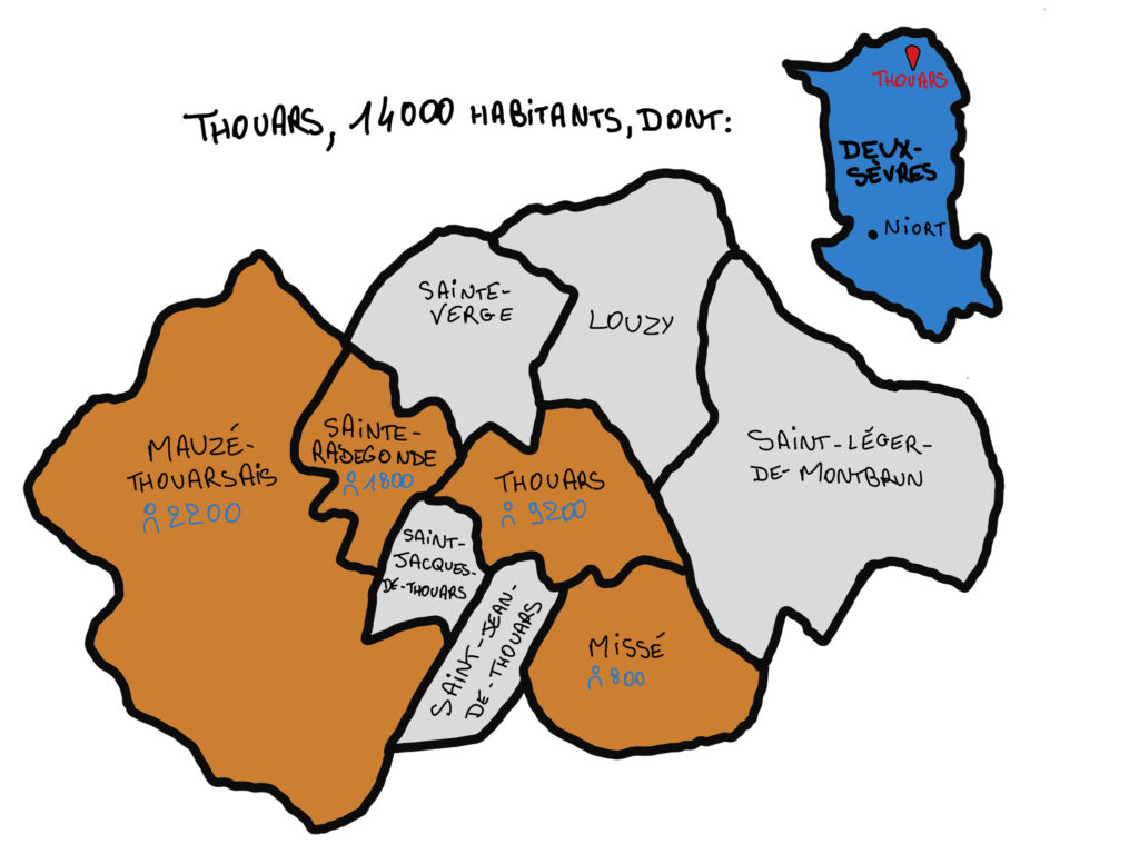 Confirmation dans une des communes fusionnées à dix kilomètres du centre de Thouars, par un couple d’aînés habitués du Café de la place, une charmante enseigne à la façade bleu ciel. « Bonjour, est-ce que vous habitez Thouars ? » Réponse spontanée : « Non, on habite Sainte-Radegonde. » Sept ans ont passé, mais les appellations sont tenaces. « On ne sait plus où on habite, on ne comprend plus qui fait quoi… » déplore Yannick Vergneau, qui regrette une fusion trop peu préparée. Une habitante de Mauzé-Thouarsais complète : « Sur les courriers, je n’écris pas Thouars, j’écris Mauzé. » Pour elle, la disparition serait plutôt celle de Monsieur le maire. « On ne le voit plus, même aux vœux du maire. Il ne se déplace quasiment jamais ici. »